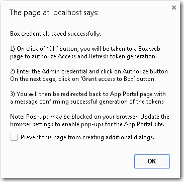 Click Save and Generate Access Token . A message box opens stating that the cloud application vendor credentials were saved successfully, and prompting you to perform additional tasks to generate a token.