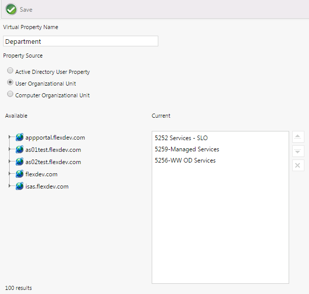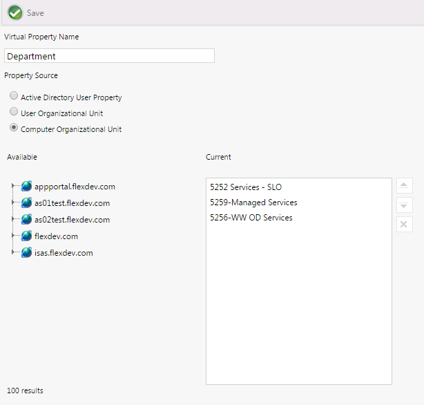 - Computer Organizational Unit —Select this option to extract values from a Computer Organizational Unit. When you select this option, a tree view of Organizational Unit s will be displayed in the Available area. Click and drag to move properties from the tree to the Current list.