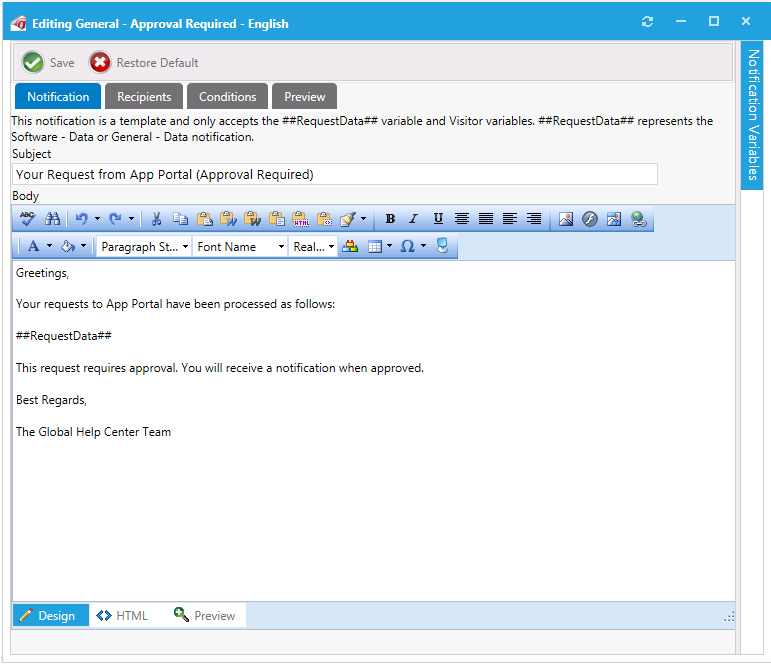 - To insert a variable into the email, click on the Notification Variables button on the right side of the dialog box to open the Notification Variables dialog box, select a variable from the list, and click Add .