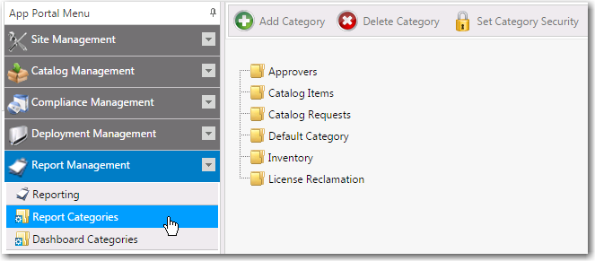 - Under Report Management , select Report Categories . Existing categories are listed in the right pane.