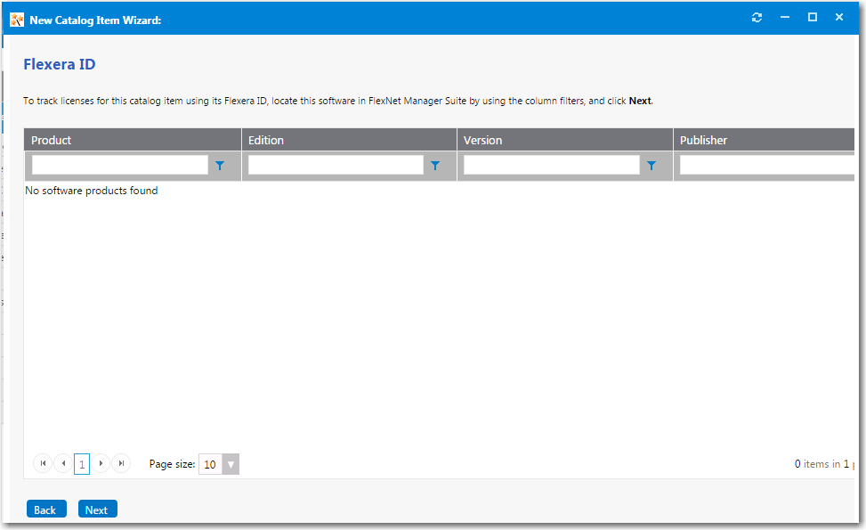 - To track licenses for this catalog item using its Flexera ID, use the column filters to locate this application or package in FlexNet Manager Suite, select it, and click Next .