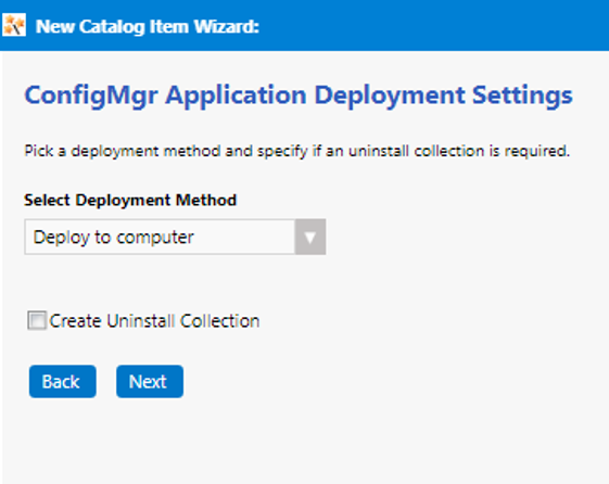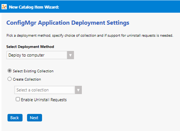 - Application—The ConfigMgr Deployment Settings panel opens when Enable selection of existing collection when creating/editing a catalog disabled.