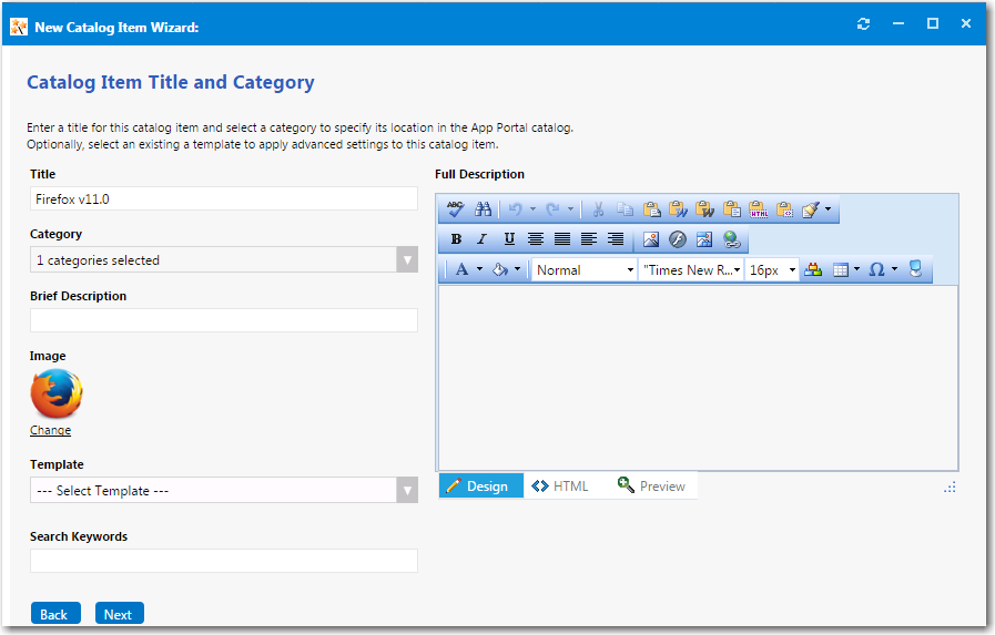 - Title—The text entered in the Title field along with the catalog item icon, will be displayed when viewing this catalog item on the Browse Catalog tab.