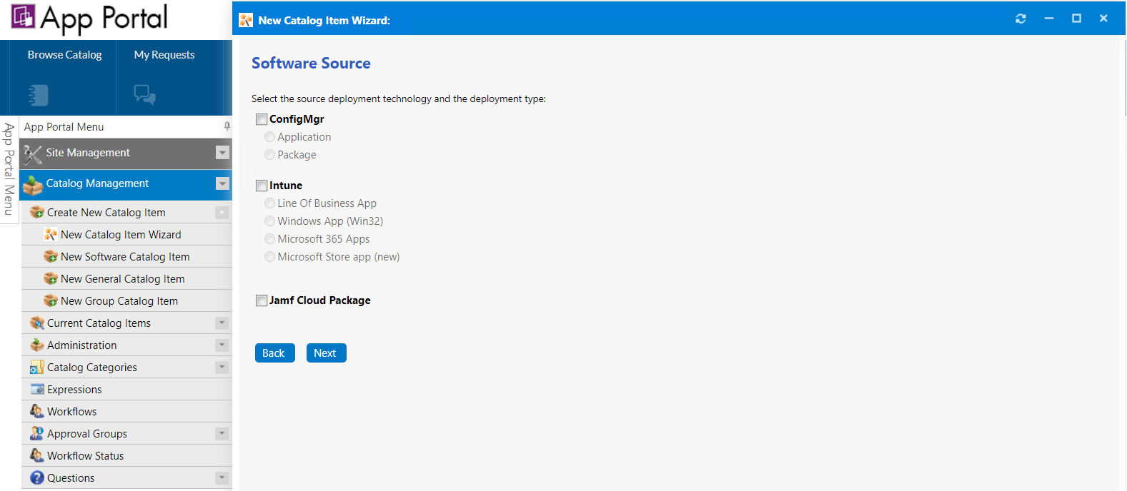 - Under Catalog Management , select New Catalog Item Wizard . The Catalog Item Type panel of the New Catalog Item Wizard opens.