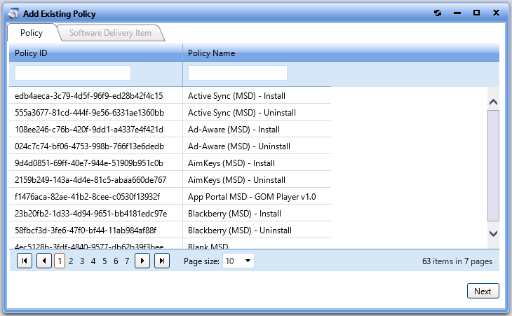 - Select a policy and click Next , the Software Delivery Item tab opens.