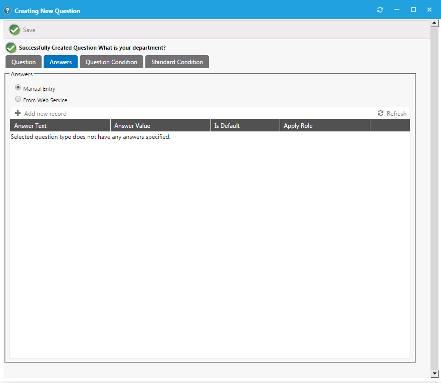 - Click Save . You are notified that the question was created successfully, and, because you selected Checkbox List , Dropdown List , or Radio Button List as the question format, the Answers tab is enabled, where you need to enter the values for the list.