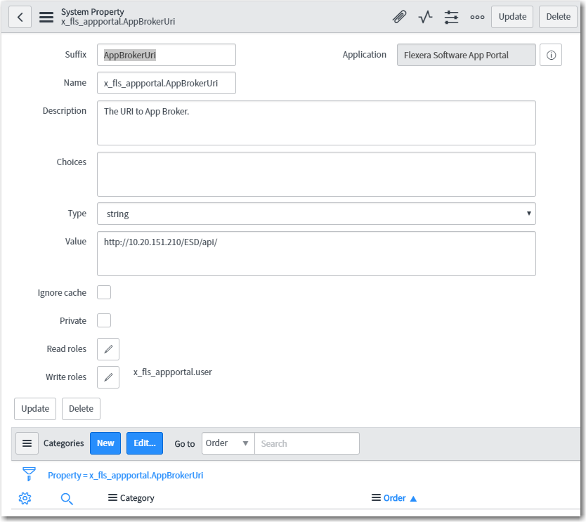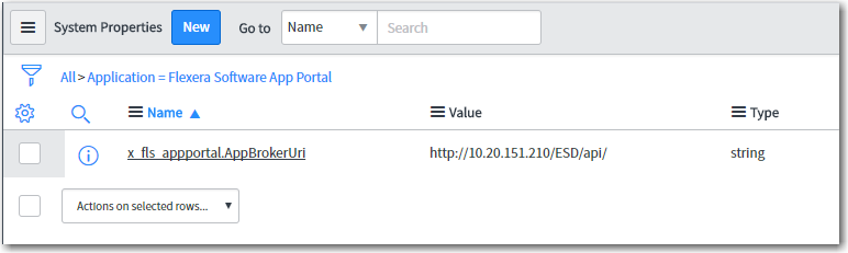 5. To connect ServiceNow to your instance of App Portal, click on x_fls_appportal.AppBrokerUrl. The System Property view for that property opens.