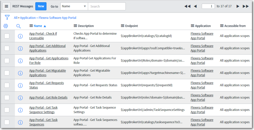 2. Under Flexera Software App Portal in the menu, click on Rest Messages . The Rest Messages view opens.