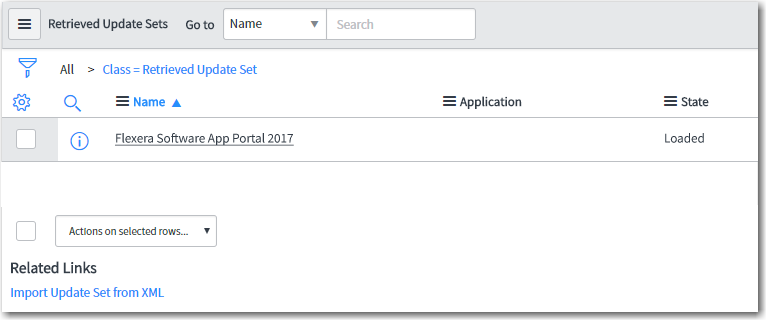 6. Click Choose File , select the Flexera Software App Portal update set .xml file and click Upload . When the upload is complete, the file will be listed on the Retrieved Update Sets page.