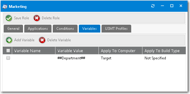 On the Variables tab of the Role Properties dialog box, you can specify variables that can be used by the task sequence process that delivers the applications specified in this role.