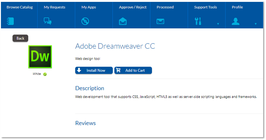In the image above, Adobe Acrobat DC Standard is classified as White which is a Preferred type. Adobe Acrobat Reader DC is classified as Grey which is Non-Preferred type. An alert message is displayed with options to choose alternates when users click Add to Cart for a Non-Preferred catalog. This is only when the Add to Cart button is clicked, not when the Install Now button is clicked.