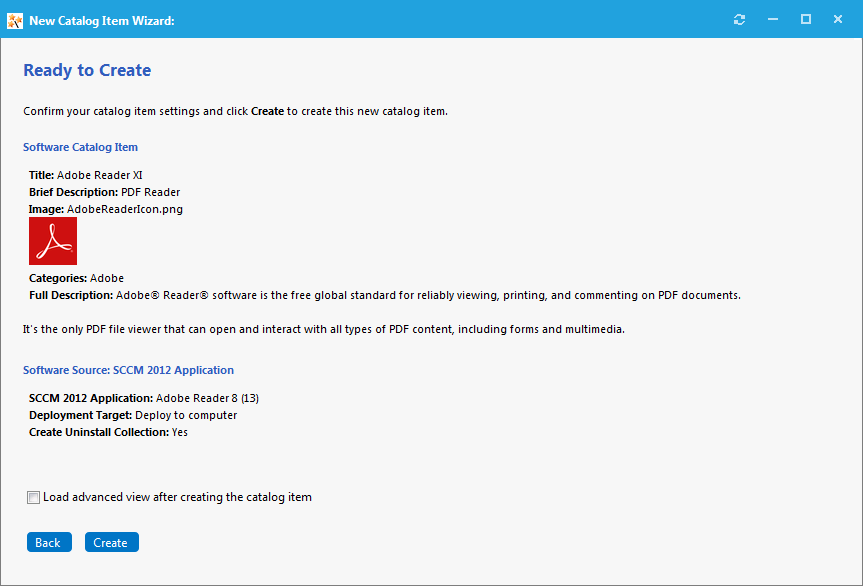 6. To add an uninstall collection to this catalog item, select the Create Uninstall Collection option. When this option is selected, users will be able to submit an uninstall request from App Portal, and System Center Configuration Manager will uninstall the application. App Portal will inform the user when the uninstall is complete.