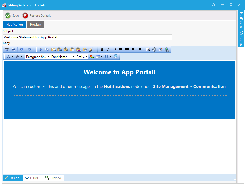 - Under Site Management , select Communication > Notifications . The Notifications View opens.