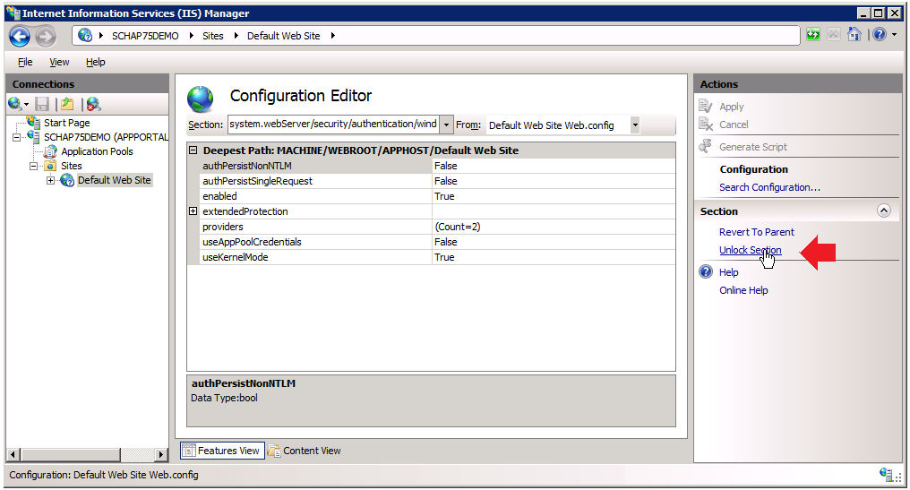 Unlock Windows Authentication / Anonymous Authentication in IIS for the Default Web Site in Windows Server 2008 R2, 2012, 2012 R2, 2016, 2022)